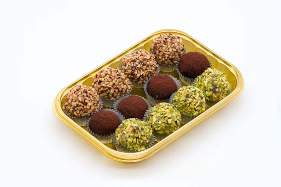 Pan di spagna lavorato con marmellata di albicocca, cioccolato e rum. Possono essere ricoperti al pistacchio, nocciole o cacao. Prodotto freschissimo al 100%