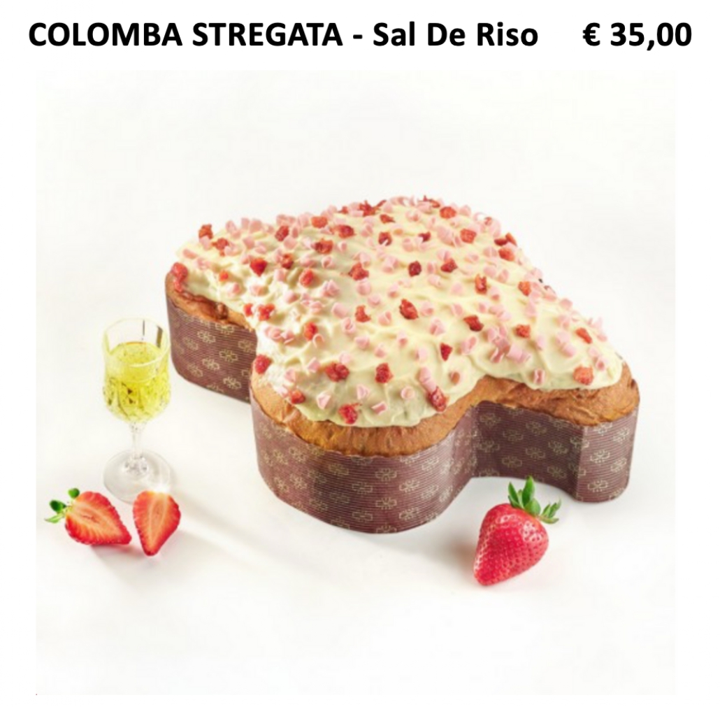 Copertura: cioccolato bianco (zucchero, burro di cacao, latte intero in polvere, emulsionante: lecitina di soia, aroma naturale di vaniglia), crema pasticcera profumata al liquore “Strega Alberti”, liquore “Strega Alberti”, trucioli di cioccolato rosa (zucchero, burro di cacao, latte intero in polvere, siero di latte in polvere, lattosio, lecitina di soia, aroma naturale vaniglia, colorante: estratto di carota) e fragole candite.
